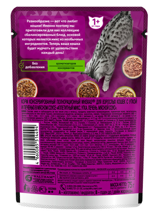 Whiskas жидкие 75г (Аппетитный микс, Утка печень и мясной соус)