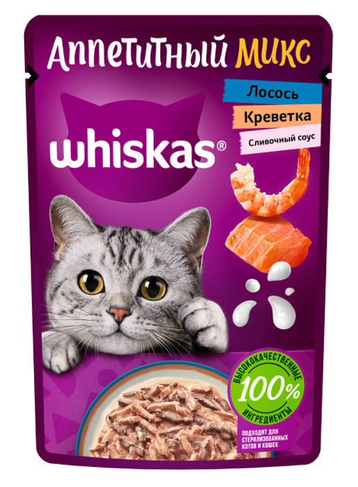 Whiskas жидкие 75г (Аппетитный микс, Лосось креветки и сливочный соус)