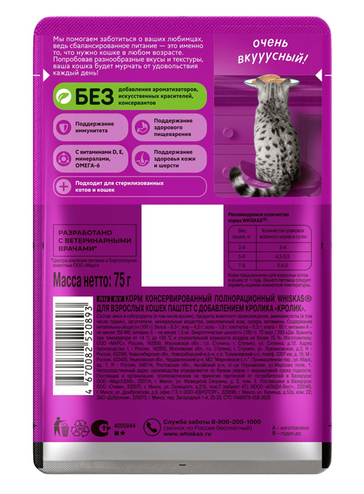 Whiskas жидкие 75г (Паштет, Кролик)