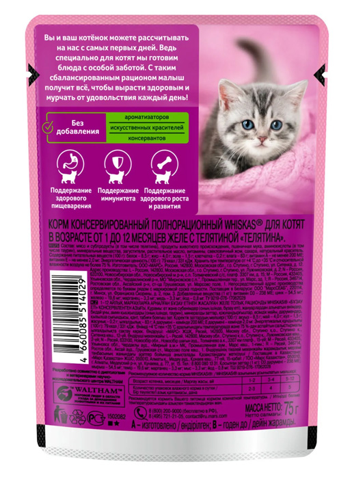 Whiskas жидкие 75г (Для котят, Рагу для курица)